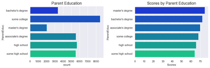 The plot below shows the influence of parental education. We observe that the highest number of parents have some college education, and the lowest number have a master’s degree. Students with parents that have a master’s degree education level have the highest scores.