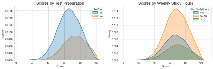 Here we can see the influence of test preparation and weekly study hours. Students who prepare for tests perform better than those who do not. More study time (more than 10 hours per week) leads to higher overall grades.