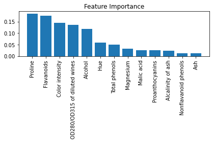 Here we can see the relative importance of the features in the wine dataset using a random forest model.